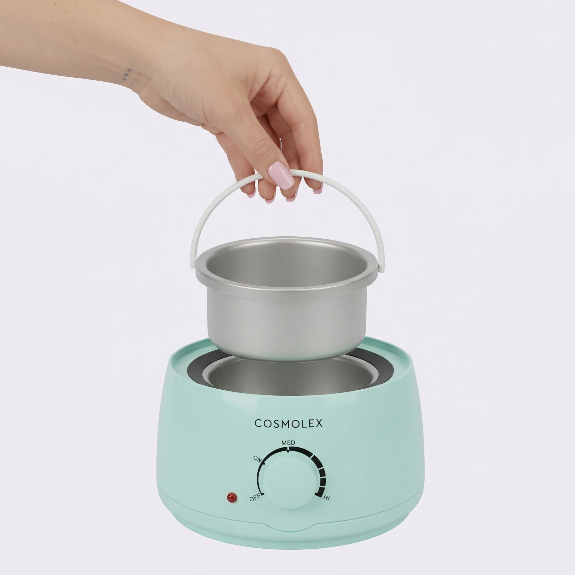 Воскоплав косметический Cosmolex — баночный воскоплав со съёмной алюминиевой чашей 400 мл для профессионального и домашнего использования. Работает от сети 220 В, регулятор температуры от 35 до 100°C, прогрев за 15–20 минут. Функция равномерного обогрева 360° предотвращает перегрев, сигнальная лампочка упрощает контроль. Компактный, подходит для всех зон: брови, лицо, подмышки, бикини, ноги. Плавит воск, парафин и пасту для шугаринга. Идеальный подарок для мамы, подруги или сестры.
