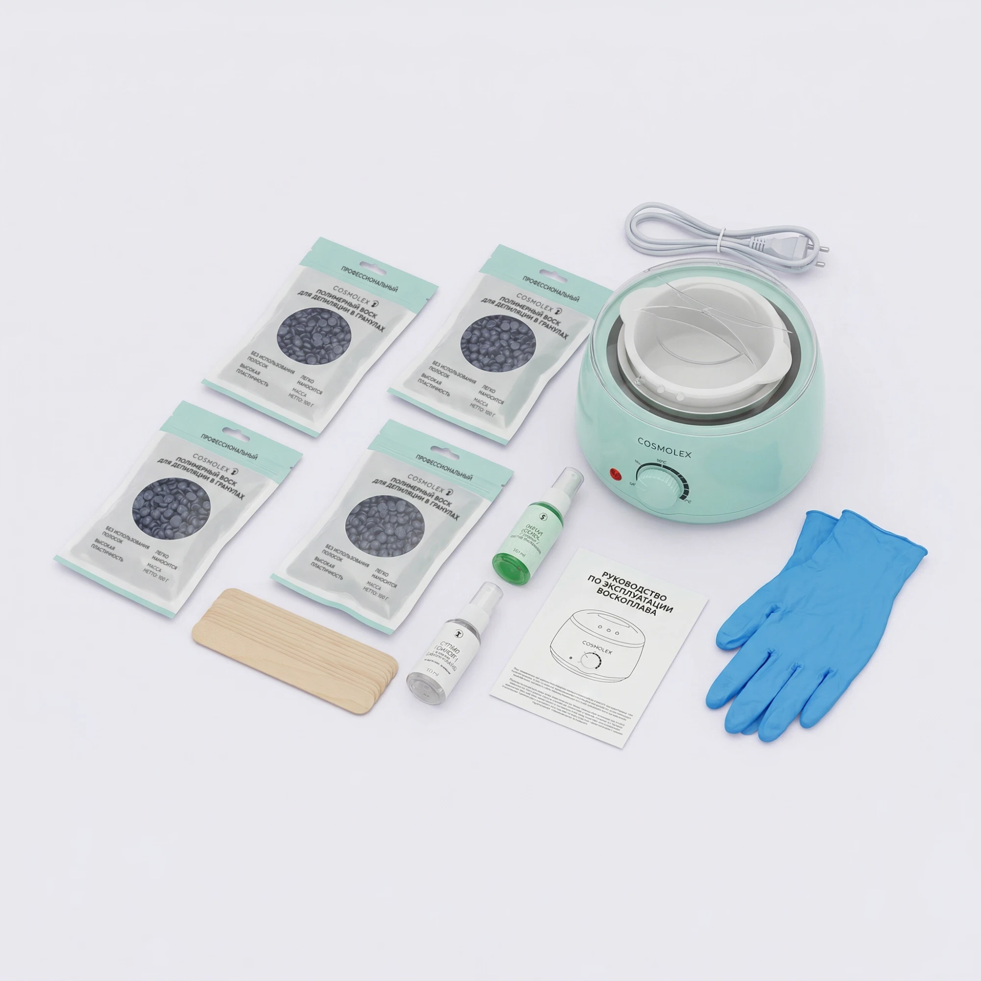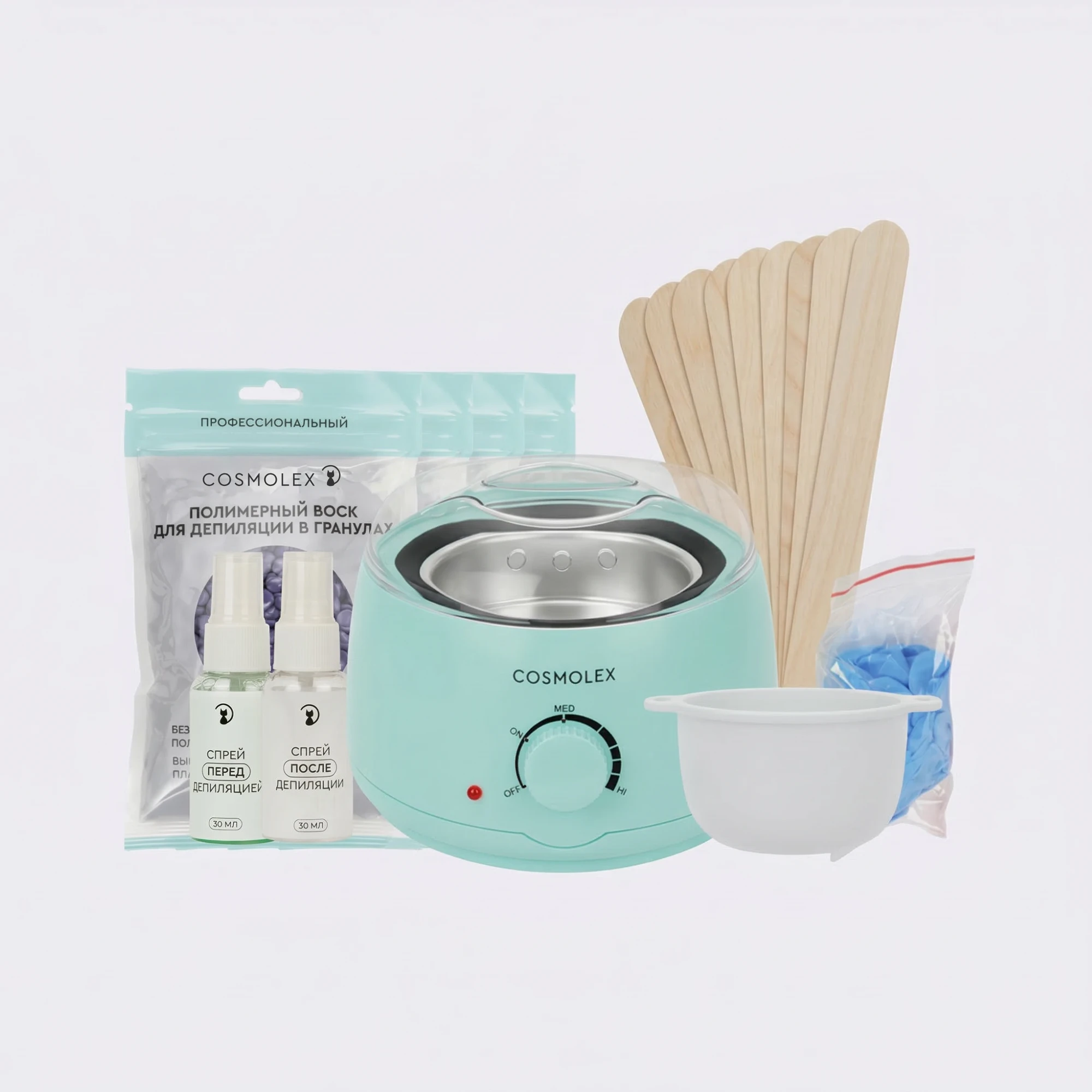 Набор 10 в 1 для депиляции Cosmolex — всё необходимое для комфортной домашней депиляции. В комплекте: профессиональный баночный воскоплав 400 мл с терморегулятором (35–100°C), дополнительная силиконовая чаша, 4 упаковки гранулированного воска (400 гр), два спрея (до и после), деревянные шпатели (10 шт.) и защитные перчатки. Подходит для всех зон: бикини, ноги, подмышки, брови. Можно использовать с воском и пастой для шугаринга. Гарантия 365 дней. Идеальный подарок для женщин.