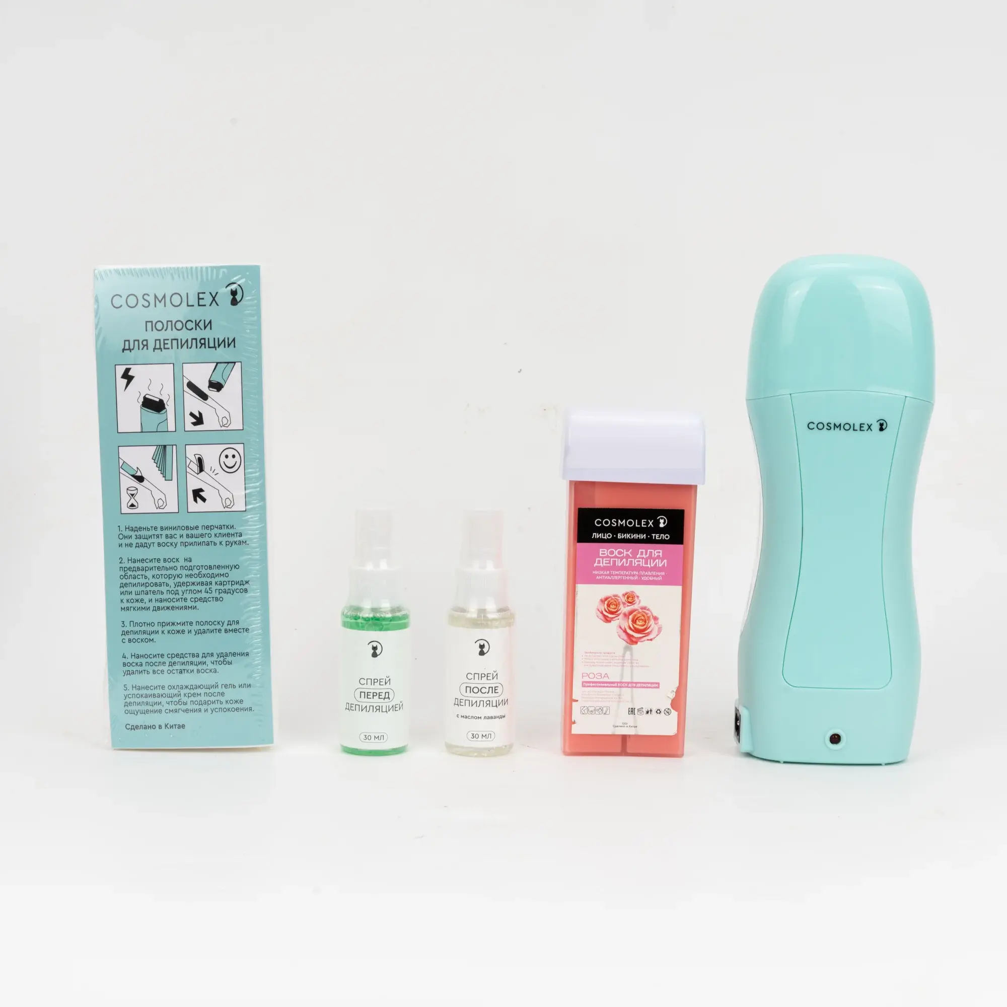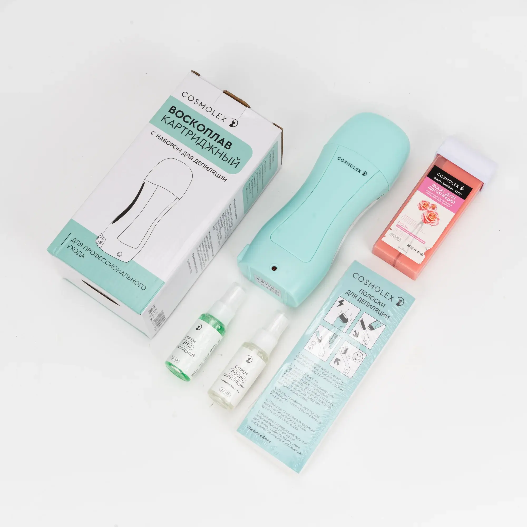 Набор для депиляции Cosmolex включает в себя: Нагреватель воска (воскоплав) на100 мл. Воск в картридже - 1 шт. Спрей для предварительной обработки- 30 мл. Завершающий спрей после воска - 30 мл. Полоски для депиляции - 50 шт.